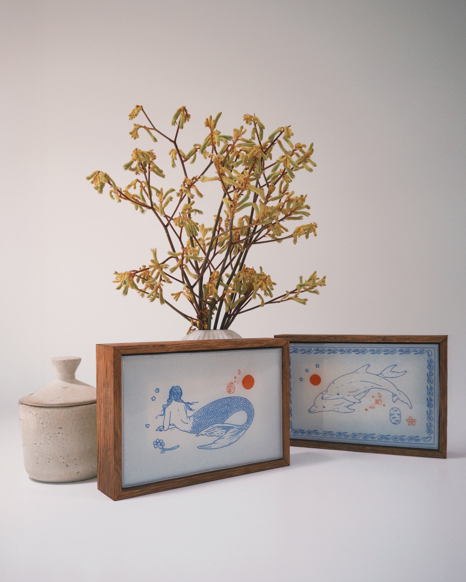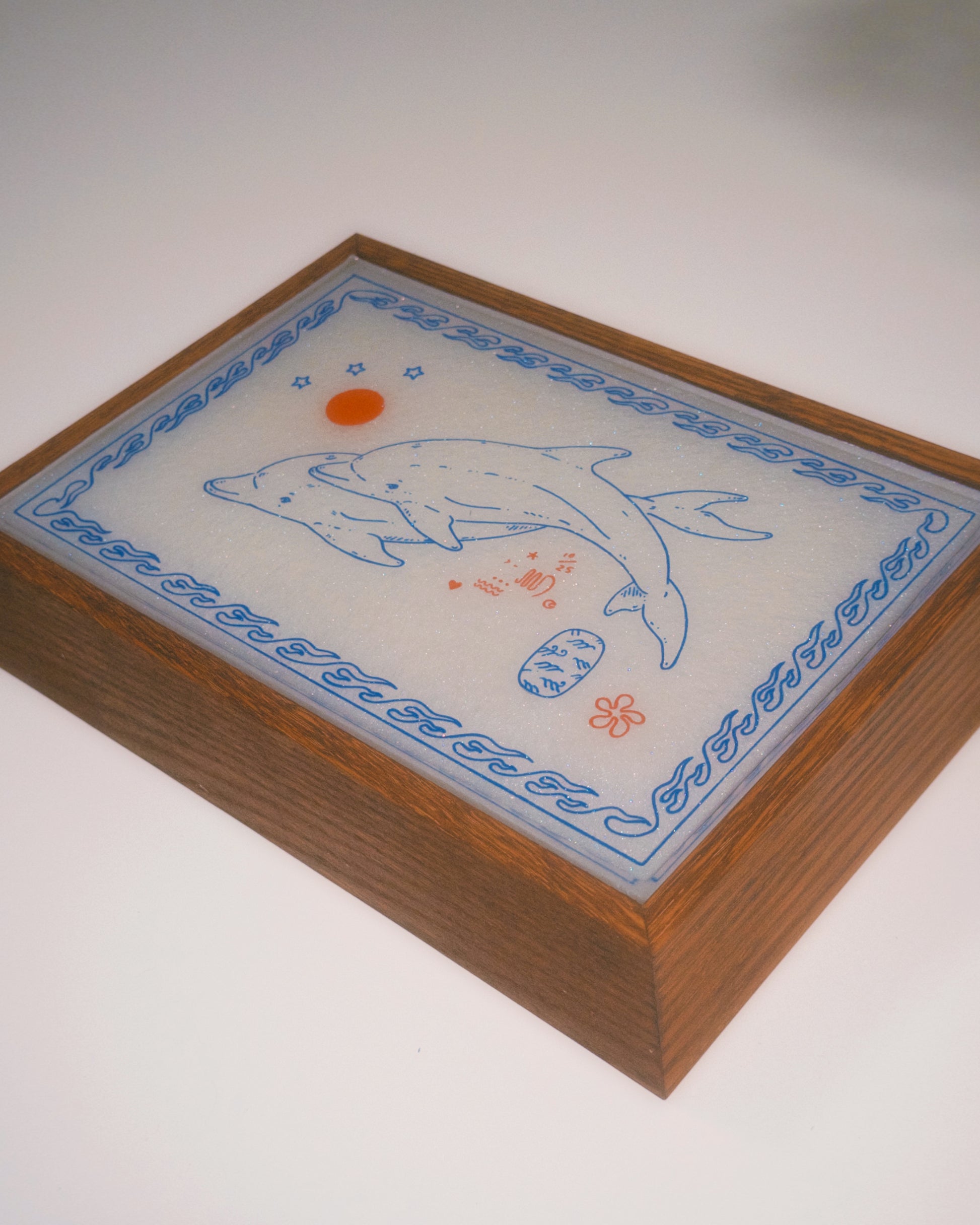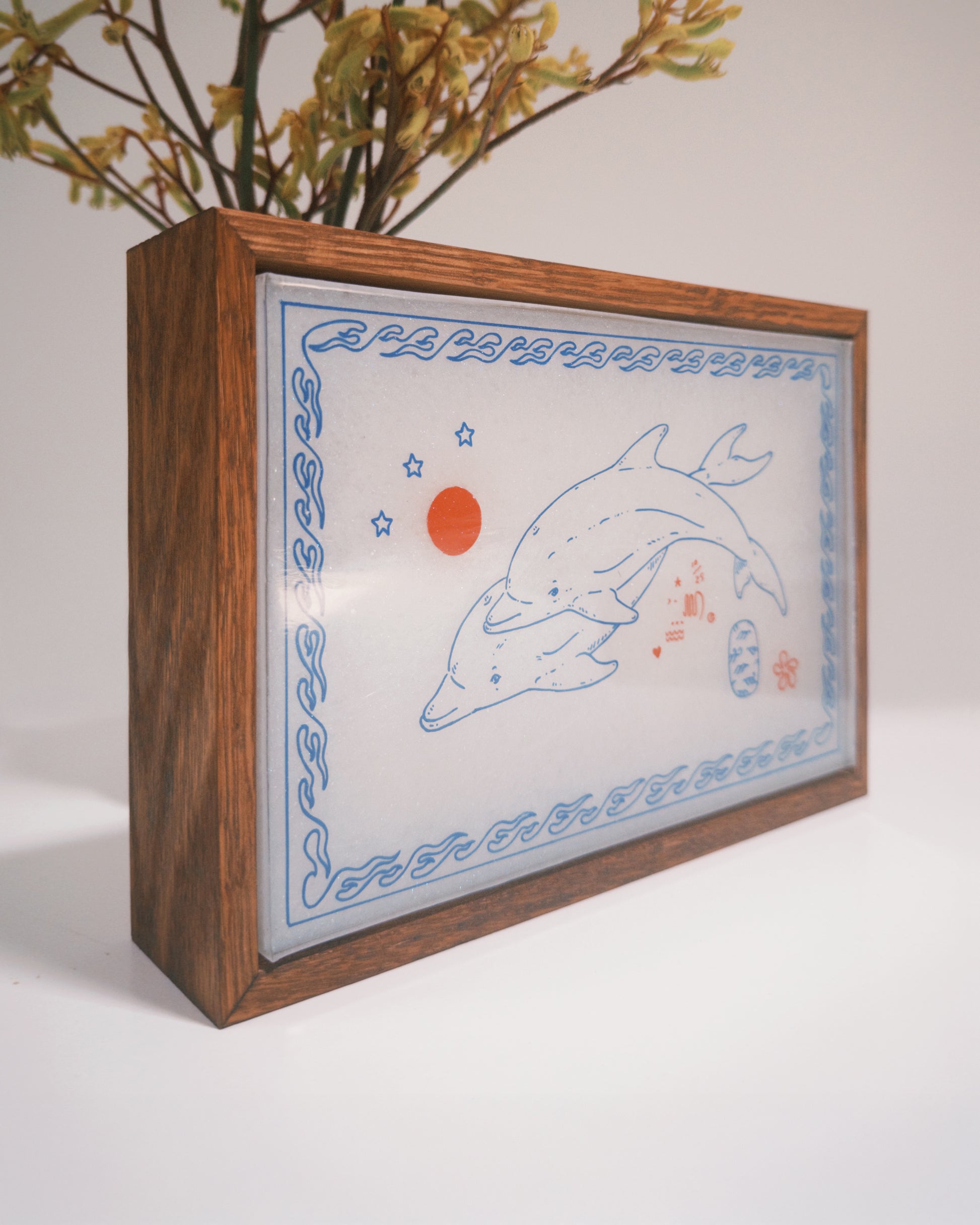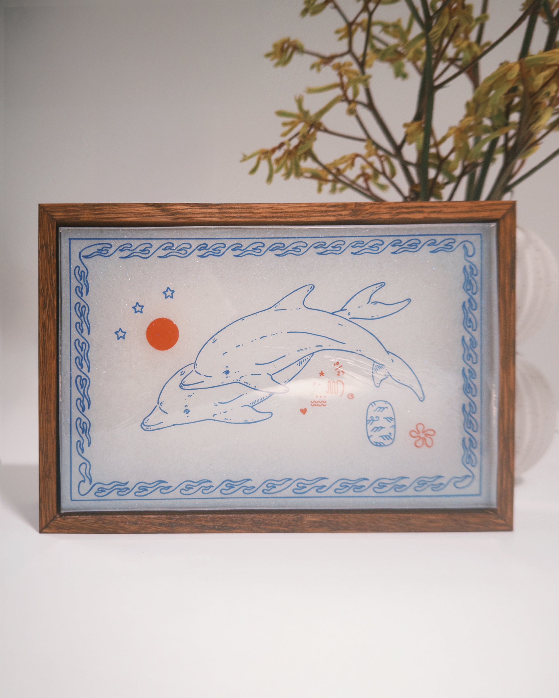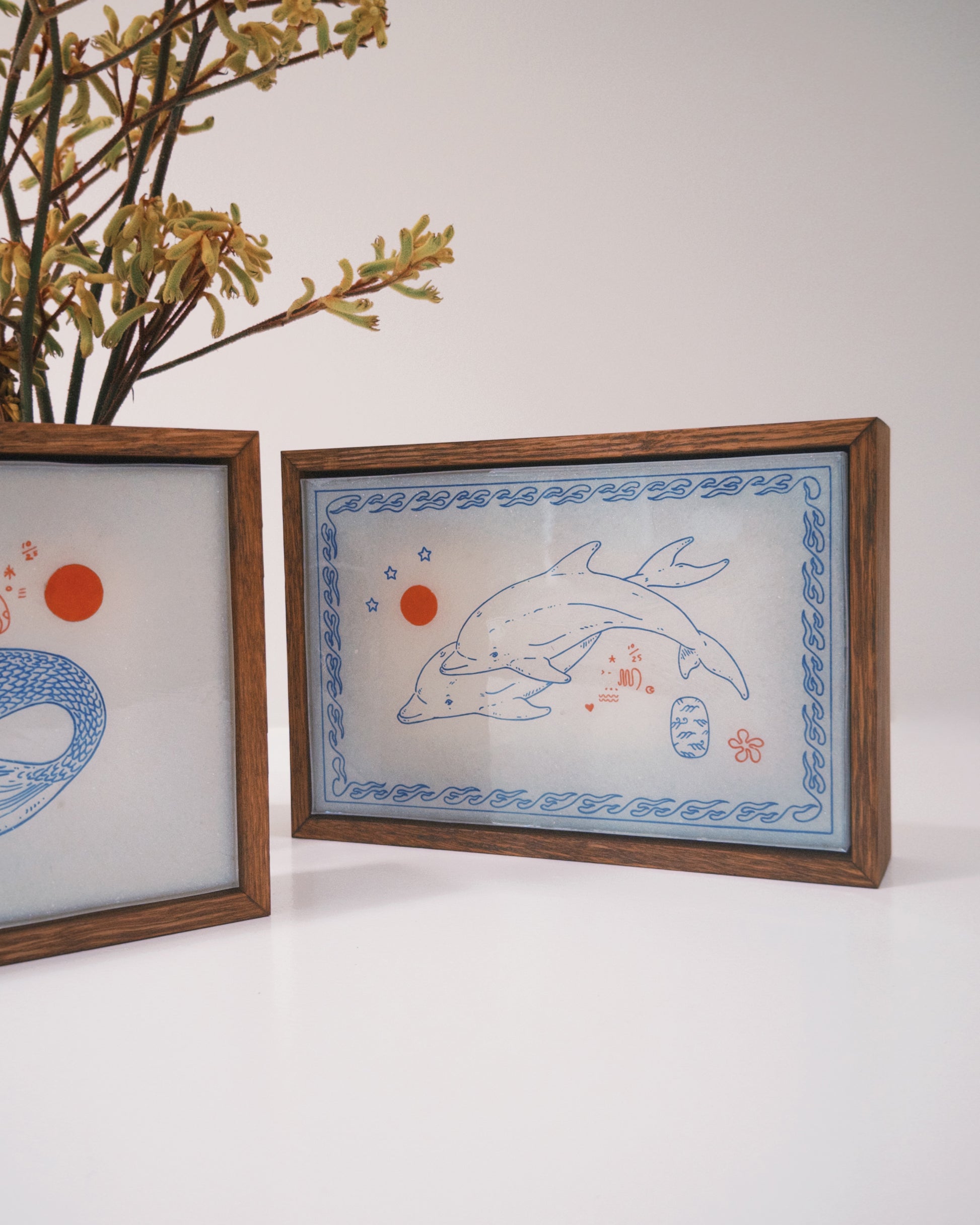 This artwork was created by pouring slightly pigmented opal resin into a mould. After it cures, the artwork itself is created by hand with posca pen. A second layer of resin poured over the top seals the artwork in a high-gloss finish with a subtle glitter shimmer. A small piece perfect for a bedside table vignette, or wherever you need a little moment of aquatic escape. The small size of the artworks with the slightly thicker frame means they can either be hung from a wall, or left to safely stand upright on their own.