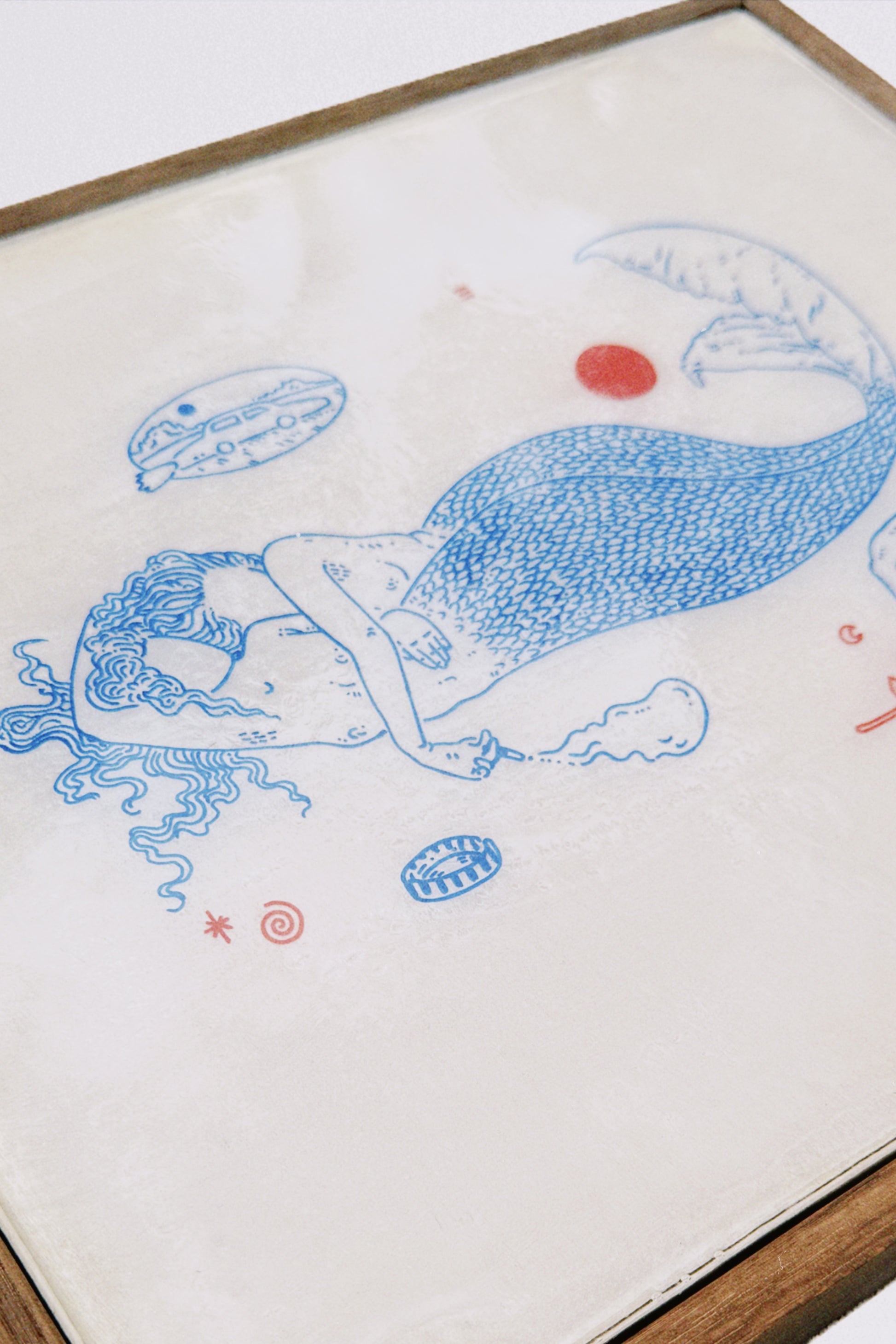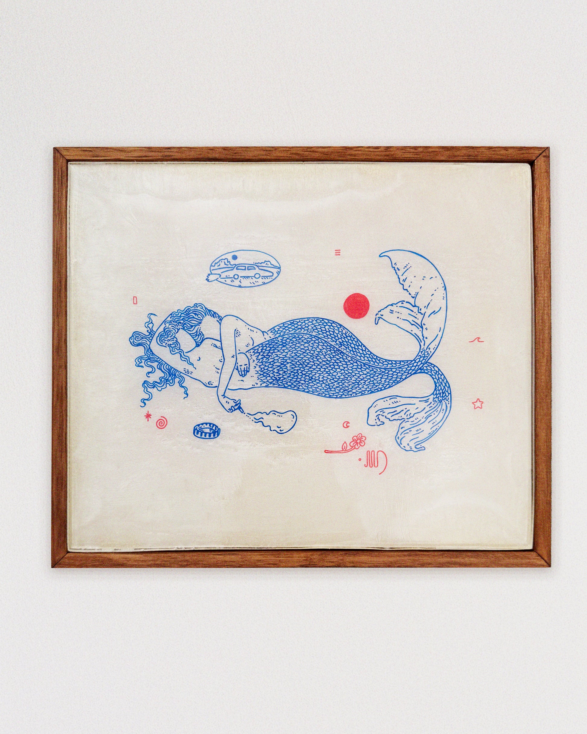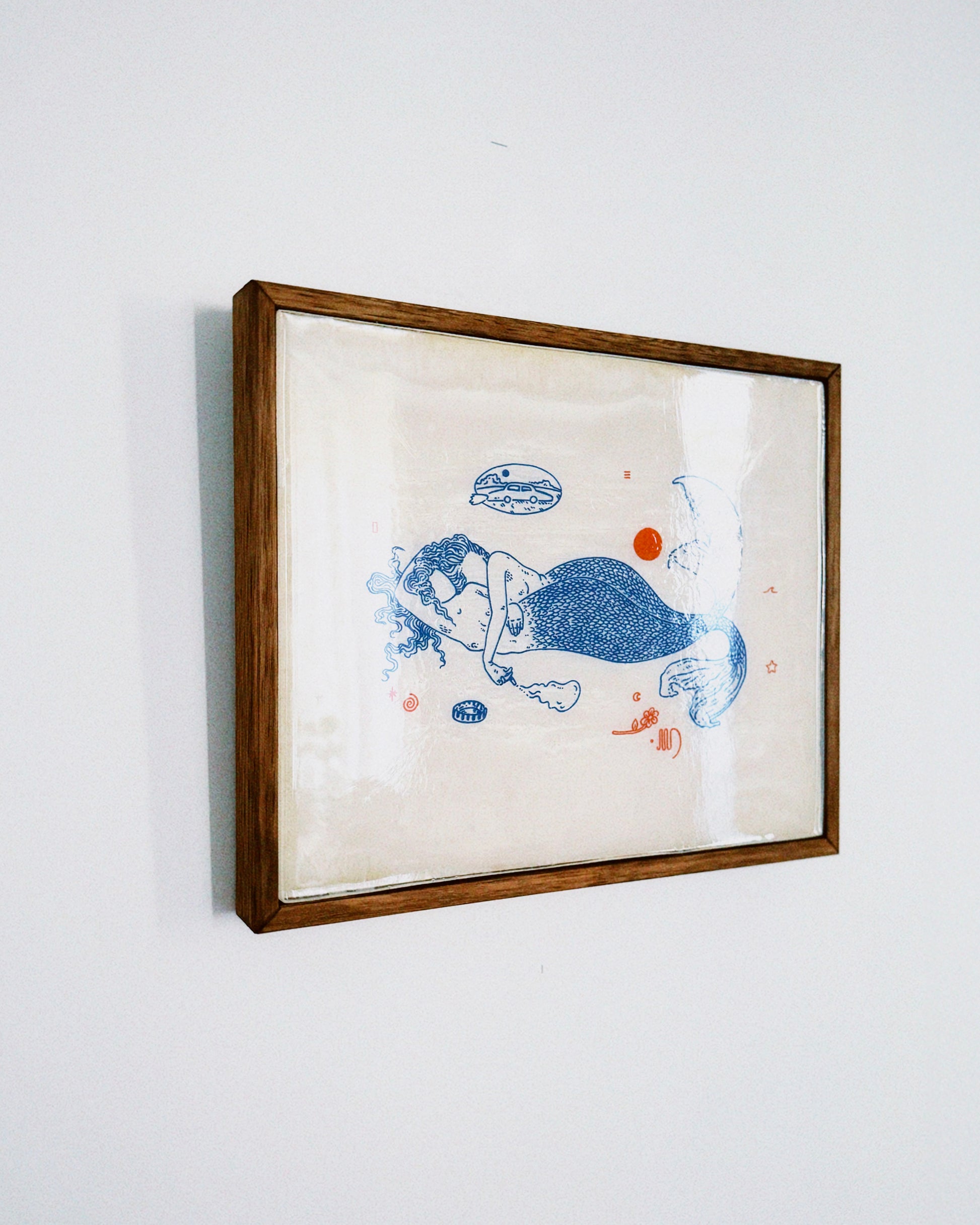 30x25cm. Resin, glitter pigment, posca pens on wood panel. Ready to hang in professional crafted oak floating frame.