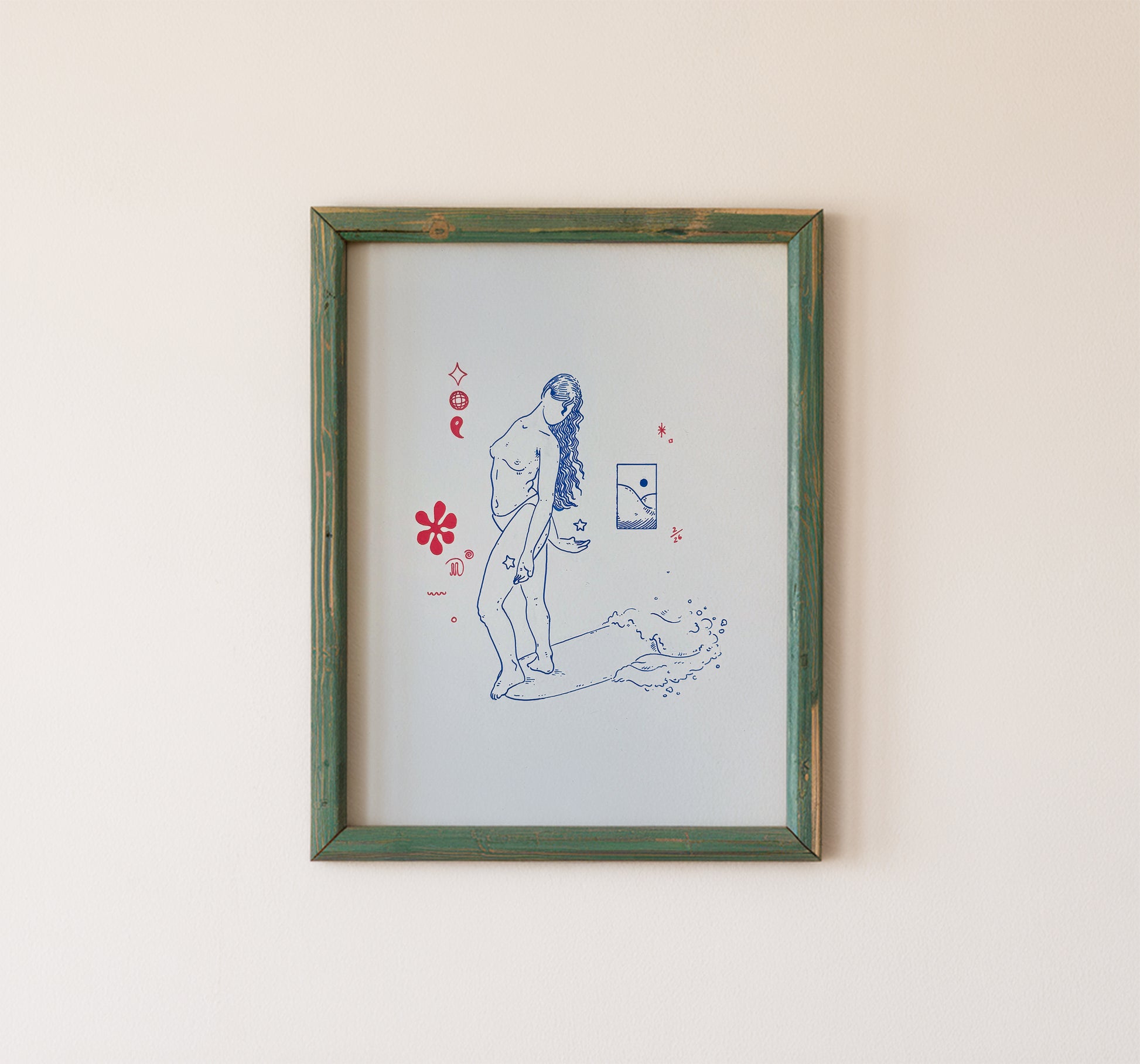 This artwork nods to the powerful feminine figure; fluid, introspective, and grounded in motion. Drawn in clean blue linework with red symbolic accents, she stands poised at the edge of a wave.