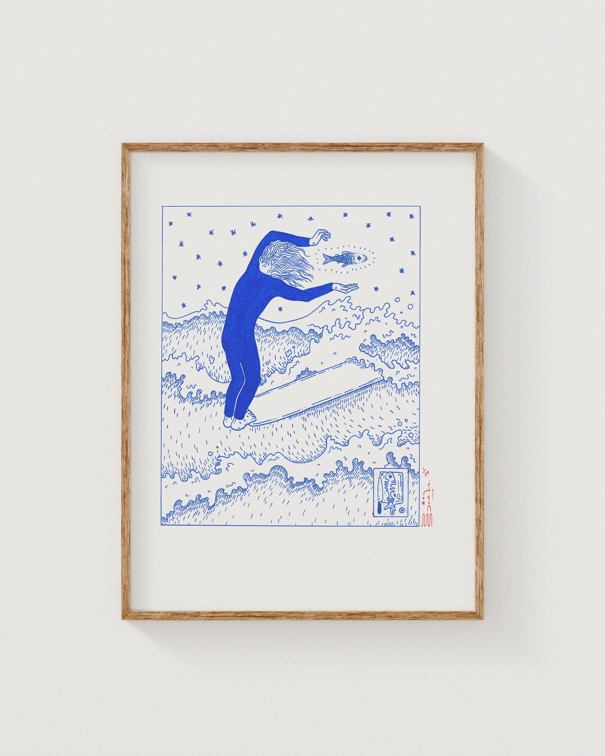 With fine blue line work on soft textured paper, invite this minimalist surf style into any beach shack, work space, or quiet corner that needs an artistic refresh. Works great as a diptych with another of my blue pieces.