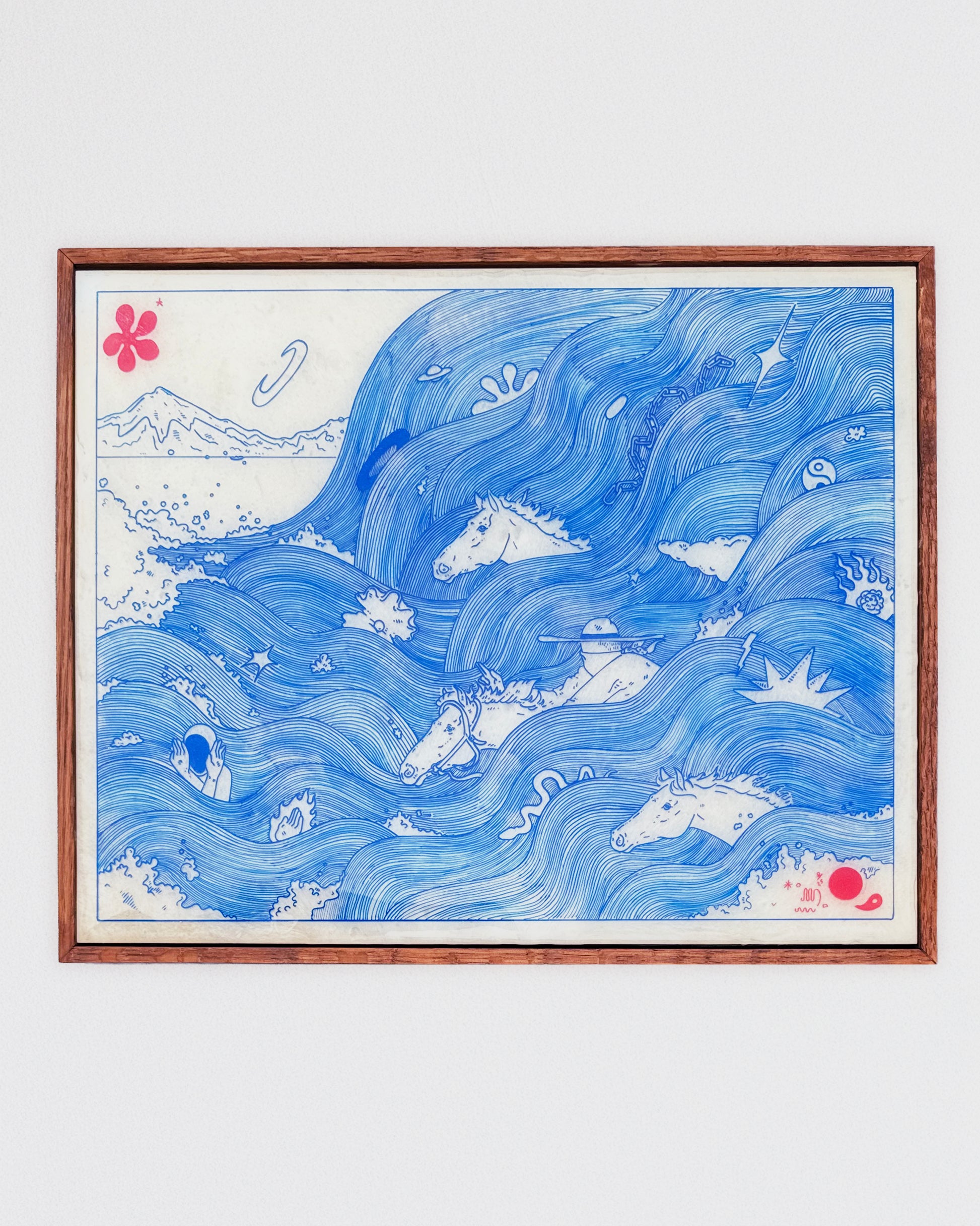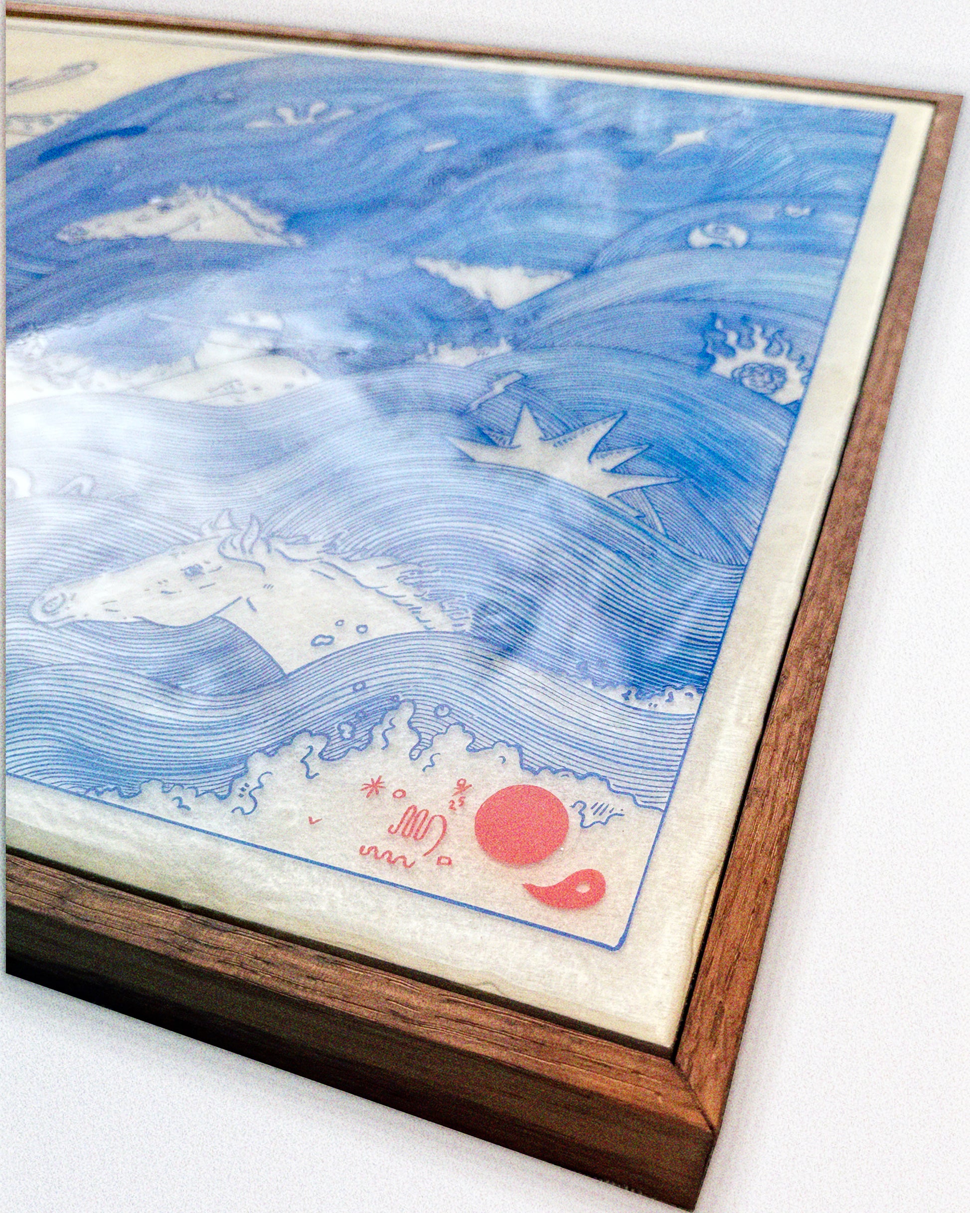 50x40cm. Resin, glitter pigment, posca pens on wood panel. Ready to hang in professional crafted oak floating frame.