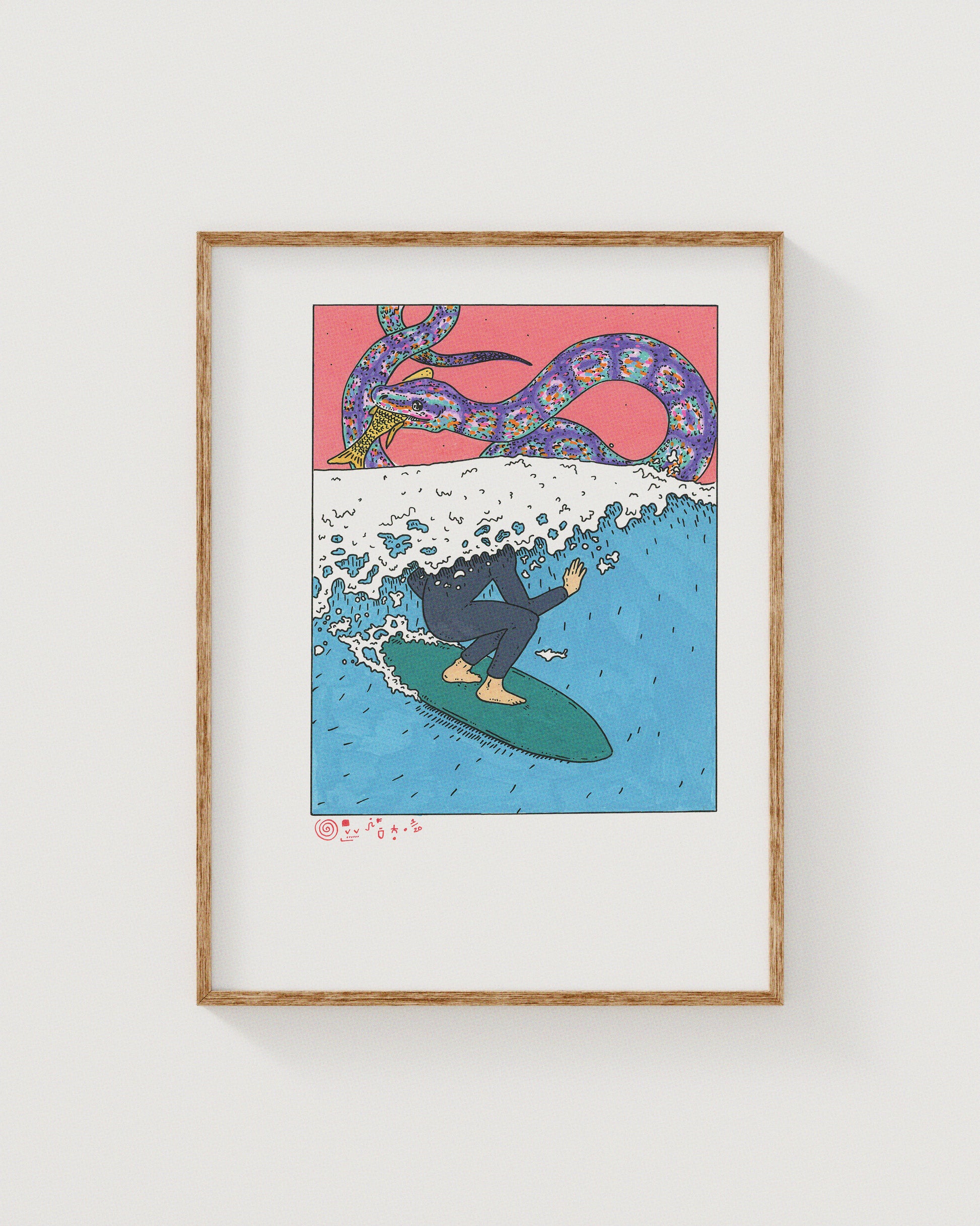 “World Serpent #3” is a reproduced print of one of my coloured pieces. In this world saturated with colour, a man surfs, comfortable in the midst of a giant, ancient spirit, who seeks the golden fish to feast on.
